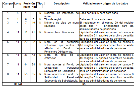 | 9 | 11 | 56 | 66 | N | Valor intereses de mora sobre el aporte. | Tomado en el campo 7 del registro tipo 9 del Anexo Técnico 2. |