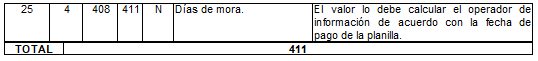 | 8 | 4 | 52 | 55 | N | Número de días de mora liquidados. | Tomado en el campo 6 del registro tipo 11 del Anexo Técnico 2. |