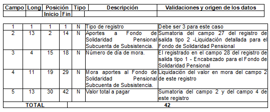 | 6 | 15 | 37 | 51 | N | Total a pagar al Fondo de Solidaridad Pensional. | Para activos es el tomado en el campo 3 del registro tipo 12 del Anexo Técnico 2. Para pagadores de pensiones es el tomado en el campo 3 del registro tipo 7 del Anexo Técnico 3. |