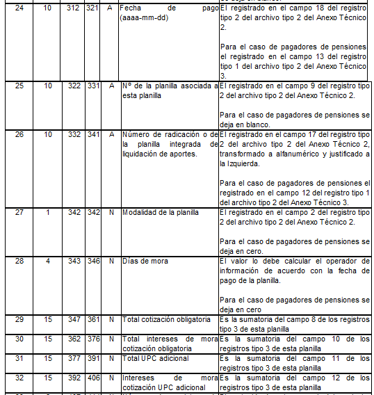 | 5 | 15 | 22 | 36 | N | Total a pagar a pensiones. | Para activos es el tomado en el campo 2 del registro tipo 12 del Anexo Técnico 2. Para pagadores de pensiones es el tomado en el campo 2 del registro tipo 7 del Anexo Técnico 3. |