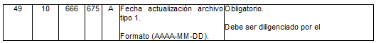 | 7 | 10 | 38 | 47 | A | Fecha de apertura de liquidación forzosa administrativa o judicial. (AAA-MM-DD) | Este campo se reportará en blanco |