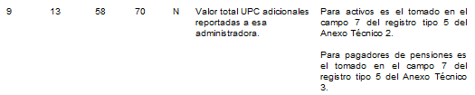 | 8 | 1 | 49 | 49 | N | Dígito de verificación de la CCF. | Para activos es el tomado en el campo 5 del registro tipo 7 del Anexo Técnico 2. Para pagadores de pensiones es el tomado en el campo 5 del registro tipo 6 del Anexo Técnico 3. |