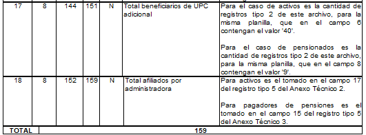 | 17 | 8 | 188 | 195 | N | Total Beneficiarios UPC adicional | Sumatoria de los campos 17 de los registros tipo 5 de esta planilla. |