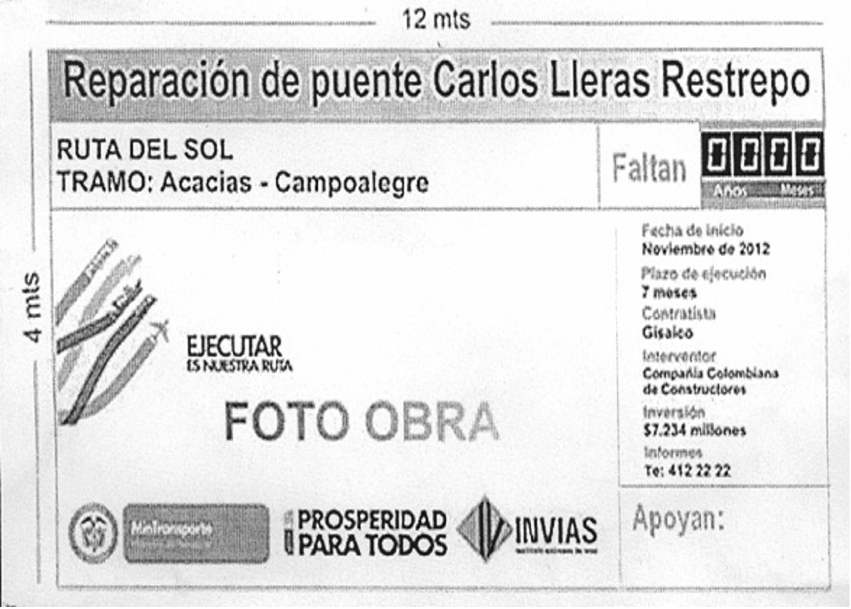 Textos: Sobre el área superior en fondo color naranja Pantone 1671C y letra negra, Fuente Arial Black tamaño 1500 puntos, se especifica el nombre de la obra. Debajo, en fondo blanco y en letra Arial Narrow Bold de 700 puntos en altas y en bajas negras, según prototipo, se debe identificar el tramo intervenido y al lado un contador que refiera el tiempo que falta para finalizar la obra en años y meses.