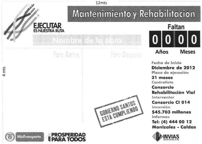 Cuando se trate de una obra y/o proyecto de infraestructura de transporte financiada o cofinanciado por la Nación, la imagen del ente territorial deberá ir al lado del logo del contratista que la ejecuta.