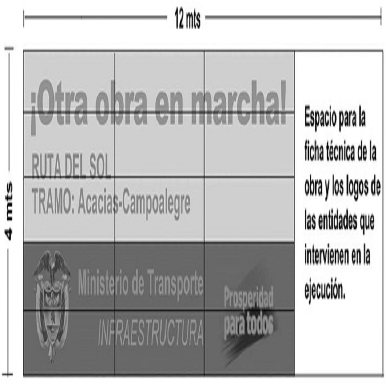 Elementos gráficos: en el área principal fondo negro; Escudo de Colombia, (sin la frase Libertad y Orden) y sello “Prosperidad para todos” y en el fondo blanco, logos de las entidades nacionales, territoriales, empresas constructoras, etc., que intervienen en la ejecución de la obra.