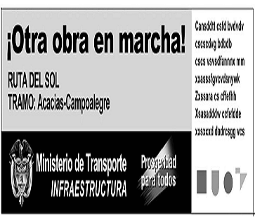 Textos: Sobre el área de fondo amarillo, en letras negras, va el título ¡Otra obra en marcha!, Arial Black, seguido del texto que identifica el nombre de la obra y el tramo, en letra Arial Narrow bold en altas y en bajas según el ejemplo adjunto. Sobre el área de fondo negro y justificados a la derecha, van en blanco los textos: Ministerio de Transporte en Arial Bold altibajas, e INFRAESTRUCTURA, en Arial Bold Italic ALTAS. A la derecha del área negra va el sello de Presidencia: “Prosperidad para todos”.