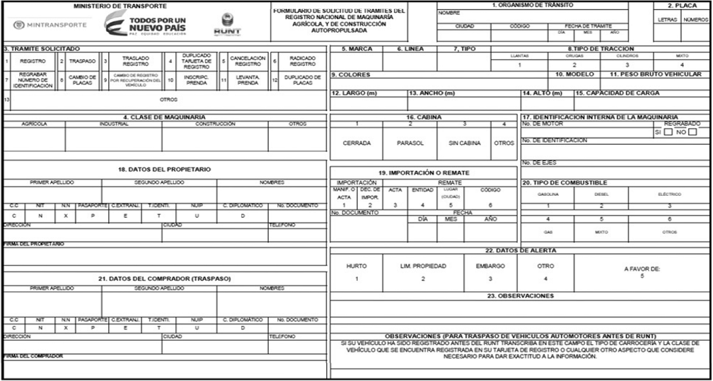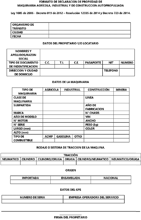 En este caso, el organismo de tránsito confrontará la información reportada en el Formulario de Declaración de Propiedad, requerirá el formulario único de trámites de maquinaria, copia de la certificación de instalación de GPS y expedirá la Tarjeta de Registro.