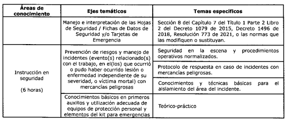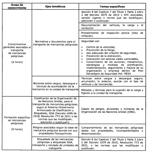 ARTÍCULO 5o. CONTENIDO E INTENSIDAD HORARIA DEL CURSO BÁSICO OBLIGATORIO DE CAPACITACIÓN PARA CONDUCTORES QUE TRANSPORTAN MERCANCÍAS PELIGROSAS. <Artículo modificado por el artículo 1 de la Resolución 20243040051775 de 2024. Rige a partir del 2 de junio de 2025, consultar en Legislación Anterior el texto vigente hasta esta fecha. El nuevo texto es el siguiente:> El curso básico obligatorio de capacitación para conductores que transportan mercancías peligrosas, podrá ser desarrollado de manera presencial o bajo la metodología a distancia y con estrategia de educación virtual, en la proporción porcentual determinada en la Resolución número 15177 de 2022 del Ministerio de Educación, o aquella que la modifique, adicione o sustituya y contemplará, como mínimo, las áreas de conocimiento, ejes temáticos, temas específicos e intensidad horaria, que se determina en la siguiente tabla: