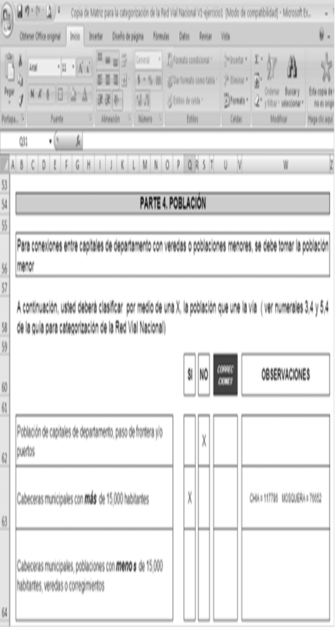 6.5. Haga clic en la celda SÍ o NO y luego marque con una “X” en la celda según corresponda de acuerdo a la población que une la vía.