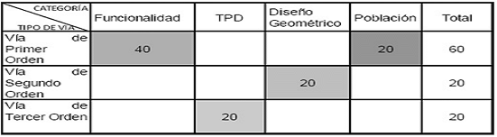 Para clasificar una vía, primero se revisa el criterio de funcionalidad. Cuando la vía se ubica en alguna de las tres categorías (de Primer Orden, de Segundo Orden o de Tercer Orden) se asigna un puntaje de 40. Luego se revisan los rangos de TPD y se asignan 20 puntos y se hace lo mismo con los criterios de diseño y población.