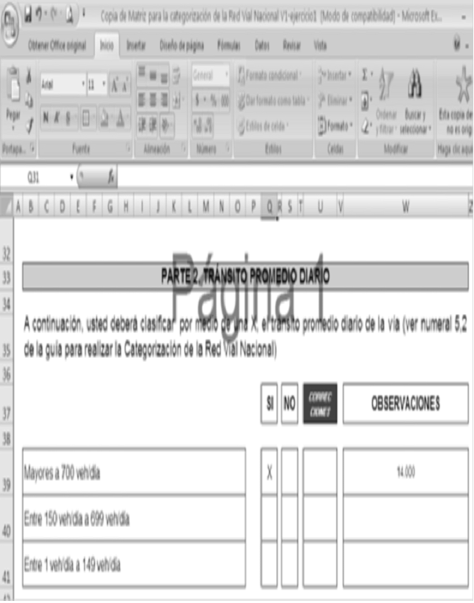 6.3. Haga clic en la celda SÍ o NO y luego marque con una “X” en la celda según corresponda de acuerdo al tránsito promedio diario de la vía.