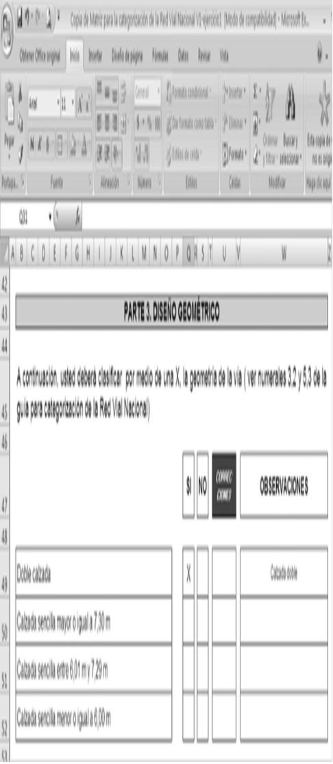 6.4. Haga clic en la celda SÍ o NO y luego marque con una “X” en la celda según corresponda de acuerdo a la geometría de la vía.
