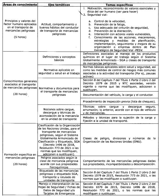 “Artículo 5o. Contenido e intensidad horaria del curso básico obligatorio de capacitación para conductores que transportan mercancías peligrosas. El curso básico obligatorio de capacitación para conductores que transportan mercancías peligrosas, podrá ser desarrollado de manera presencial o bajo la metodología a distancia y con estrategia de educación virtual, en la proporción porcentual determinada en la Resolución número 15177 de 2022 del Ministerio de Educación, o aquella que la modifique, adicione o sustituya y contemplará, como mínimo, las áreas de conocimiento, ejes temáticos, temas específicos e intensidad horaria, que se determina en la siguiente tabla:
