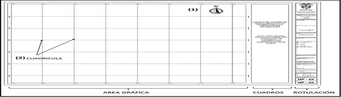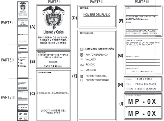 El formato para los planos de los Macroproyectos estará dividido en tres espacios destinados a: (i) la representación gráfica del proyecto, (ii) a los cuadros informativos y (iii) la rotulación.