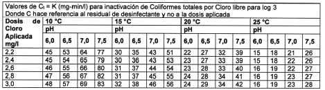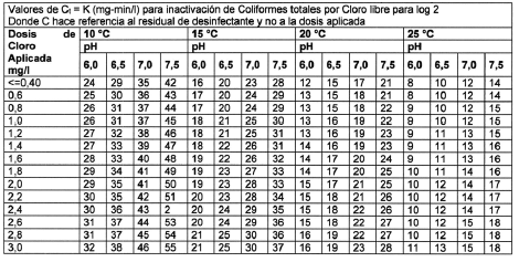 Las tablas anteriores están elaboradas para desinfección con cloro libre, entendiéndose por tal el que queda después de satisfecha la demanda. El Ministerio de Salud y Protección Social podrá exigir una remoción mayor para aguas con alta contaminación.