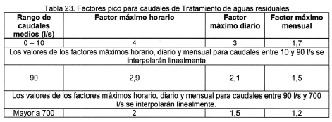 Para el diseño de las plantas de tratamiento de aguas residuales deberán utilizarse datos históricos de factores máximos del área de influencia del proyecto, de plantas de tratamiento de aguas residuales similares en tamaño y condiciones, o en su defecto, emplear los siguientes factores pico (ver Tabla 23).