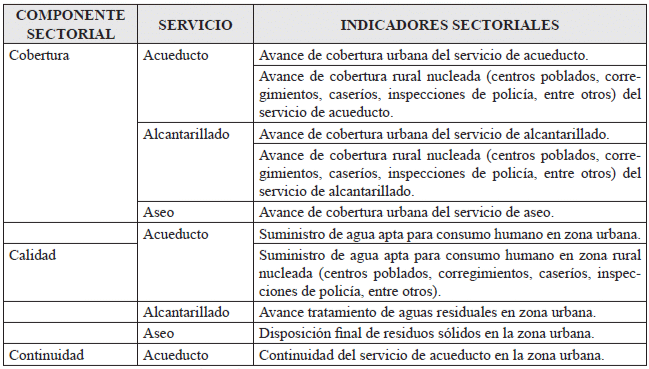 Que el numeral 1.1.1 del artículo 2.3.5.1.6.1.36 del Decreto número 1077 de 2015, estipuló que estará a cargo del Ministerio de Vivienda, Ciudad y Territorio expedir los lineamientos y directrices de la política sectorial, la cual incluye los indicadores específicos y estratégicos y la definición de las metas de cobertura, calidad y continuidad para la prestación de los servicios de acueducto, alcantarillado y aseo, que deberán incluir las entidades territoriales en sus respectivos planes sectoriales, de conformidad con lo previsto en el artículo 17 del Decreto número 028 de 2008.