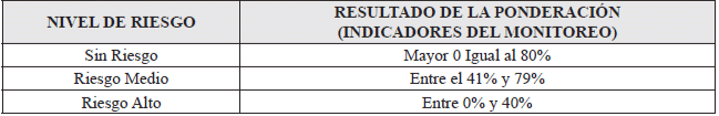 ARTÍCULO 7o. NIVEL DE RIESGO. <Resolución derogada por el artículo 14 de la Resolución 1010 de 2021> <Artículo modificado por el artículo 4 de la Resolución 98 de 2019. El nuevo texto es el siguiente:> La aplicación de lo dispuesto en el artículo anterior, determinará el nivel de riesgo del monitoreo en el que se encuentra la entidad territorial, así: