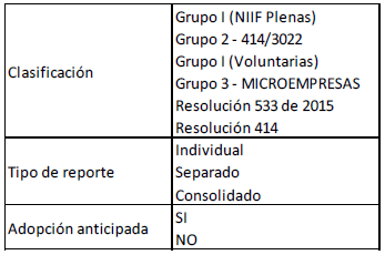 Los PSPD deberán seleccionar de la lista, Clasificación: “Resolución número 533 de 2015”, el tipo de reporte y adopción anticipada no aplican para los clasificados en Resolución número 533 de 2015, por lo tanto, deben dejar el valor que tiene por defecto o elegir “Seleccione”.