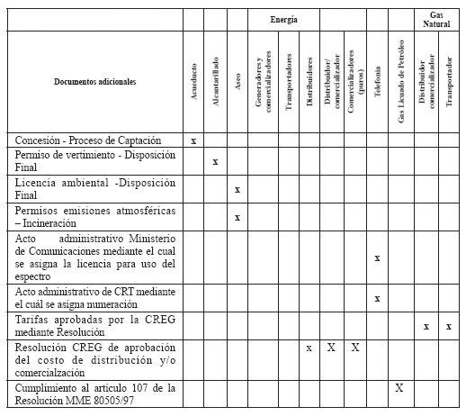 Documentos básicos: Aplican para todos los prestadores de servicios públicos domiciliarios de acueducto, alcantarillado, aseo, energía eléctrica, telefonía, gas natural y Gas Licuado del Petróleo GLP, y se debe adjuntar como mínimo uno de los siguientes documentos de constitución y de posesión o nombramiento del representante legal que apliquen de acuerdo con la naturaleza del prestador.