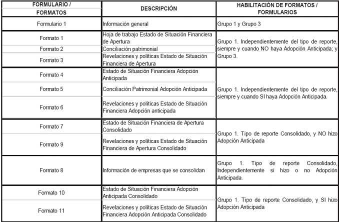 Los formatos: 1 -Hoja de trabajo Estado de Situación Financiera de Apertura, 2 -Conciliación patrimonial y 3 -Revelaciones y políticas Estado de Situación Financiera de Apertura, se habilitarán a las empresas prestadoras de servicios públicos clasificadas en el Grupo 1, independientemente del tipo de reporte (individual, separado o consolidado), siempre y cuando hayan respondido negativamente a “Adopción Anticipada” de las NIIF, en el formulario 1 de información general; y para todas las empresas prestadoras de servicios públicos domiciliarios que se hayan clasificado en el Grupo 3.