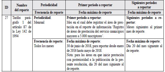 ARTÍCULO 11. Aclarar el texto de la “Fecha máxima de reporte” del numeral “27. Tarifas parágrafo 1 del artículo 87 de la Ley 142 de 1994”, contenido en el cronograma de cargue de información del Anexo 1, de la Resolución SSPD 20174000237705 de 2017, modificado por la Resolución SSPD 2018400018825 de 2018, el cual quedará así: