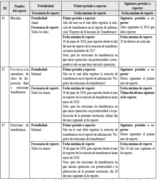 ARTÍCULO 15. Modificar el texto del “Primer período a reportar” del numeral “41. Básculas”, y el texto de la “Fecha máxima de reporte” del numeral “47. Estaciones de transferencia”, y adicionar el reporte de información correspondiente al numeral “42. Facturación operadores de sitios de disposición final y estaciones transferencia” en el cronograma de cargue de información contenido en el Anexo 1, de la Resolución SSPD 20174000237705 de 2017, modificado por la Resolución SSPD 20184000018825 de 2018, para los prestadores que realizan la actividad de Transferencia, los cuales quedarán así: