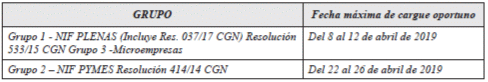 ARTÍCULO 1o. PLAZOS. El cargue de información financiera correspondiente al año 2018 para los prestadores de servicios públicos domiciliarios, que se encuentren bajo marcos normativos para grupos 1, 2 y 3, así como Resoluciones número 414 de 2014, 533 de 2015 y 037 de 2017, expedidas por la Contaduría General de la Nación, deberá efectuarse en las siguientes fechas: