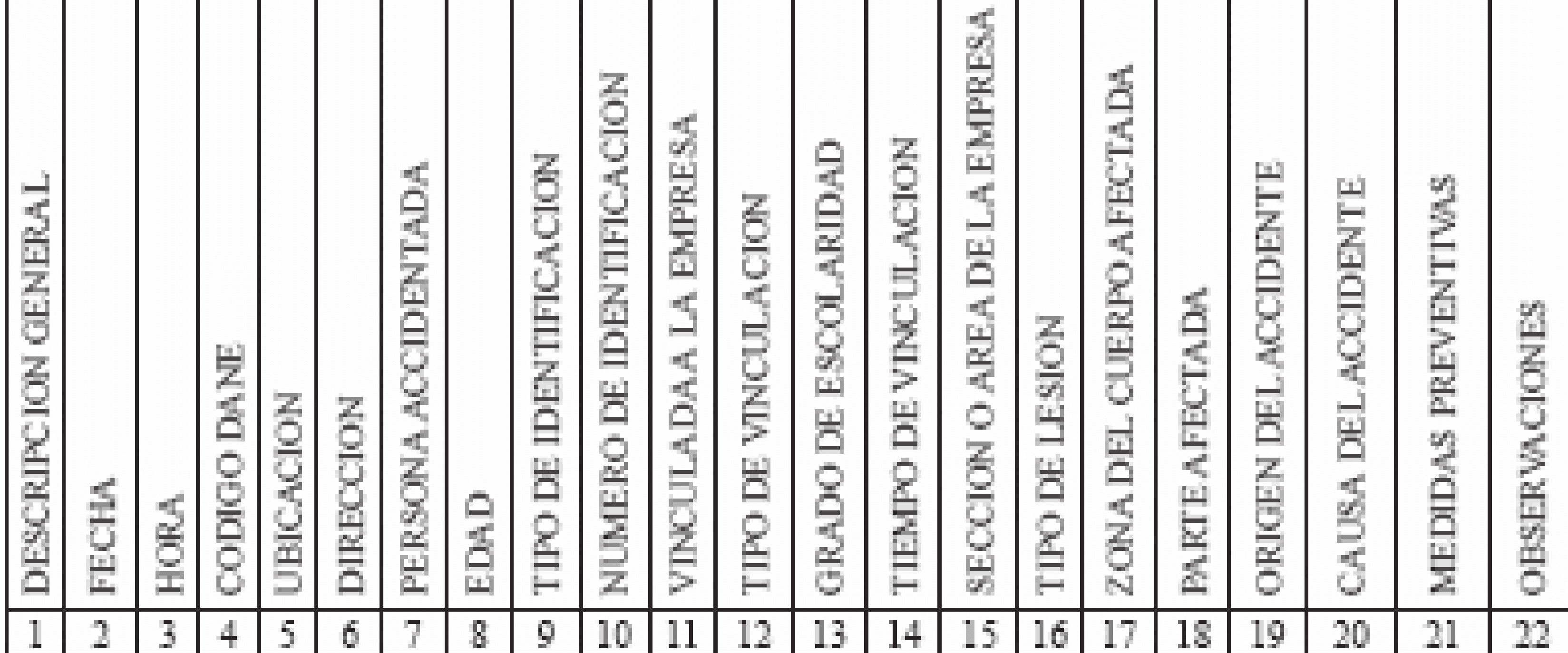 Esta información corresponde a la descripción general sobre los acontecimientos de accidente, fecha y hora del accidente, Código DANE de la zona geográfica donde ocurrió el accidente, la localización, ubicación y dirección del sitio del accidente, información básica de la persona accidentada, sección de la empresa donde ocurrió el accidente, tipo de lesión ocasionada, zona (s) y parte (s) del cuerpo afectadas, actividades y maniobras que se ejecutaban al momento del accidente, causas del accidente y medidas preventivas que se habían tomado.