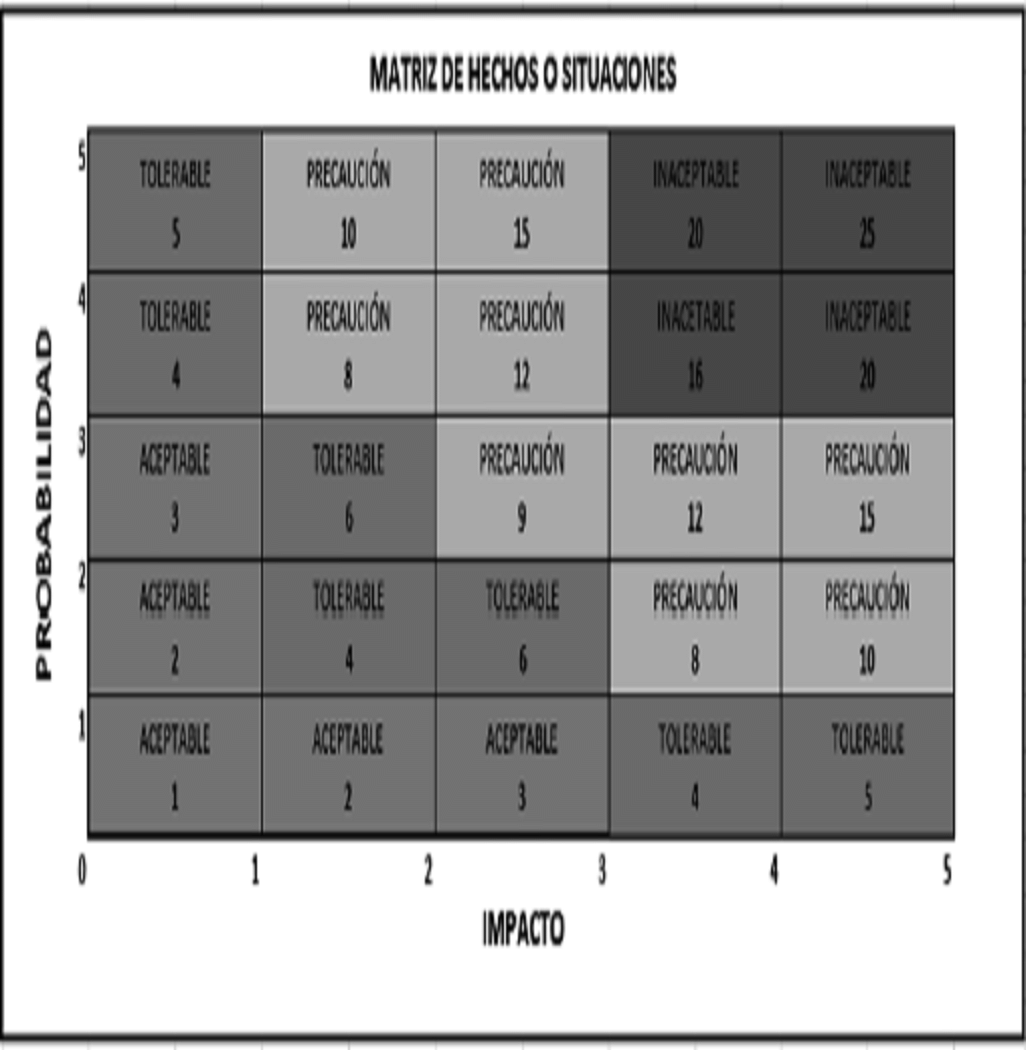 En este caso, se determinaron las escalas de frecuencia e impacto, obteniendo una matriz de hechos o situaciones SAC.