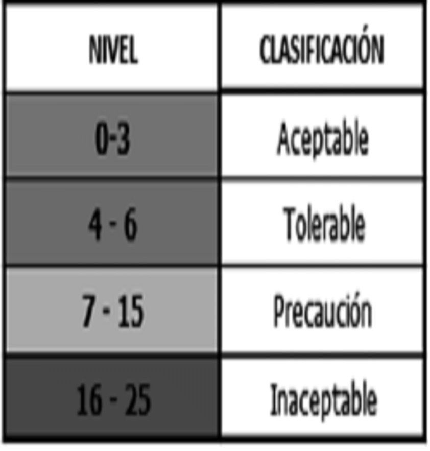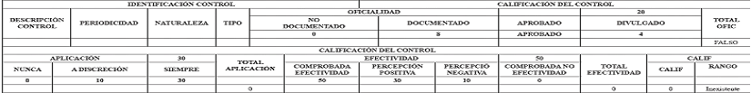 Así mismo, cada control implementado se califica a partir de tres atributos: oficialidad, aplicación y efectividad; a su vez, cada control se sitúa en un nivel dentro de cada atributo lo que permite su calificación, los niveles son: