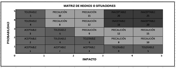 En este caso, se determinaron las escalas de frecuencia e impacto, obteniendo una matriz de hechos o situaciones SAC.