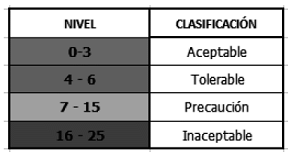 | Baja | 2 | Poco probable | Poco probable | Poco probable |