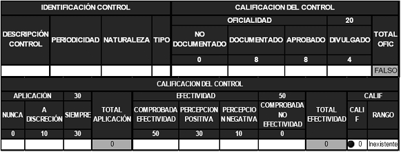 Así mismo, cada control implementado se califica a partir de tres atributos: oficialidad, aplicación y efectividad; a su vez, cada control se sitúa en un nivel dentro de cada atributo lo que permite su calificación, los niveles son: