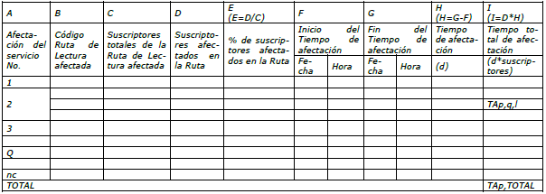 | Tiempo de afectación en la ruta de lectura I perteneciente a la afectación número q, que se presentó durante el mes p. Este parámetro se obtiene de multiplicar el número de suscriptores afectados en cada ruta de lectura (Columna D en la tabla) por el tiempo que duró la afectación en días (Columna H en la tabla). | |