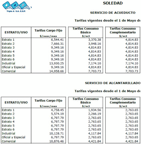 En los cuadros anteriores se observa la tarifa que triple A aplica a sus usuarios en cada estrato y uso en el distrito de Barranquilla. En estos cuadros se puede identificar el valor de los costos económicos de referencia debido a que a los usuarios del estrato 4 y del uso oficial no se aplican subsidios ni contribuciones, entonces a estos usuarios se le factura el costo económico de referencia resultante de la aplicación de la metodología tarifaria expedida por la Comisión de Regulación.