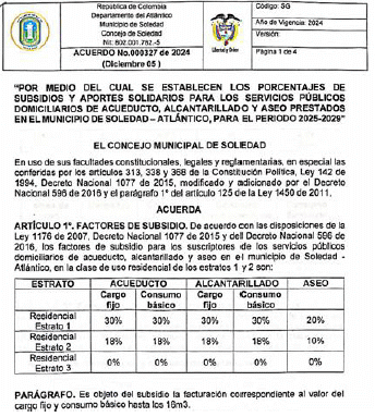 (...) Primero; El porcentaje del 18% de Subsidio aplica Sobre, la Tarifa del Cargo Fijo por Valor de $9.349 y la Tarifa de Consumo Básico por Valor de $4.814.83 Resultante de la aplicación de la metodología tarifaria expedida por, la Comision y que la Entidad Tarifaria aprobó, reporto a la Sspd y público en, la pagina Web para Cobrar el Cargo Fijo y los Consumo Básico de, los usuarios del Estrato 3 que NO son subsidiados en el Municipio de Soledad o,