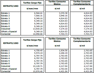 En este sentido, para el servicio de acueducto los valores de $9.349,16 en el cargo fijo, $4.814.83 en el cargo por consumo corresponden a la tarifa de los usuarios del estrato 4 y el uso oficial; pero a su vez coinciden con los costos económicos de referencia que aplica para todos los demás usuarios.