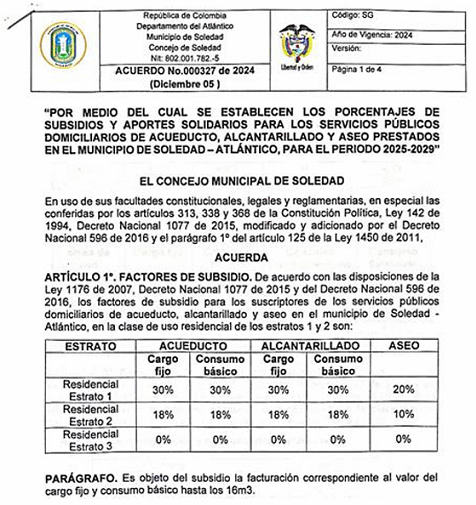 Los demás valores que se muestran en el cuadro citado, corresponden al valor del costo económico de referencia citado en los párrafos anteriores descontando el porcentaje de subsidios o incrementando el porcentaje de contribución que estableció el Concejo de Soledad del Municipio de Soledad Departamento del Atlántico mediante Acuerdo 000327 de 2024, como se muestra en la siguiente imagen: