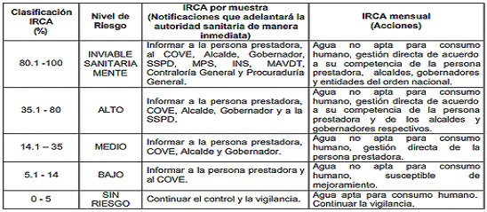 "ARTÍCULO 15. Clasificación del nivel de riesgo. Teniendo en cuenta los resultados del IRCA mensual, se define la siguiente clasificación del nivel de riesgo del agua suministrada para el consumo humano por la persona prestadora y se señalan las acciones que debe realizar la autoridad sanitaria competente: