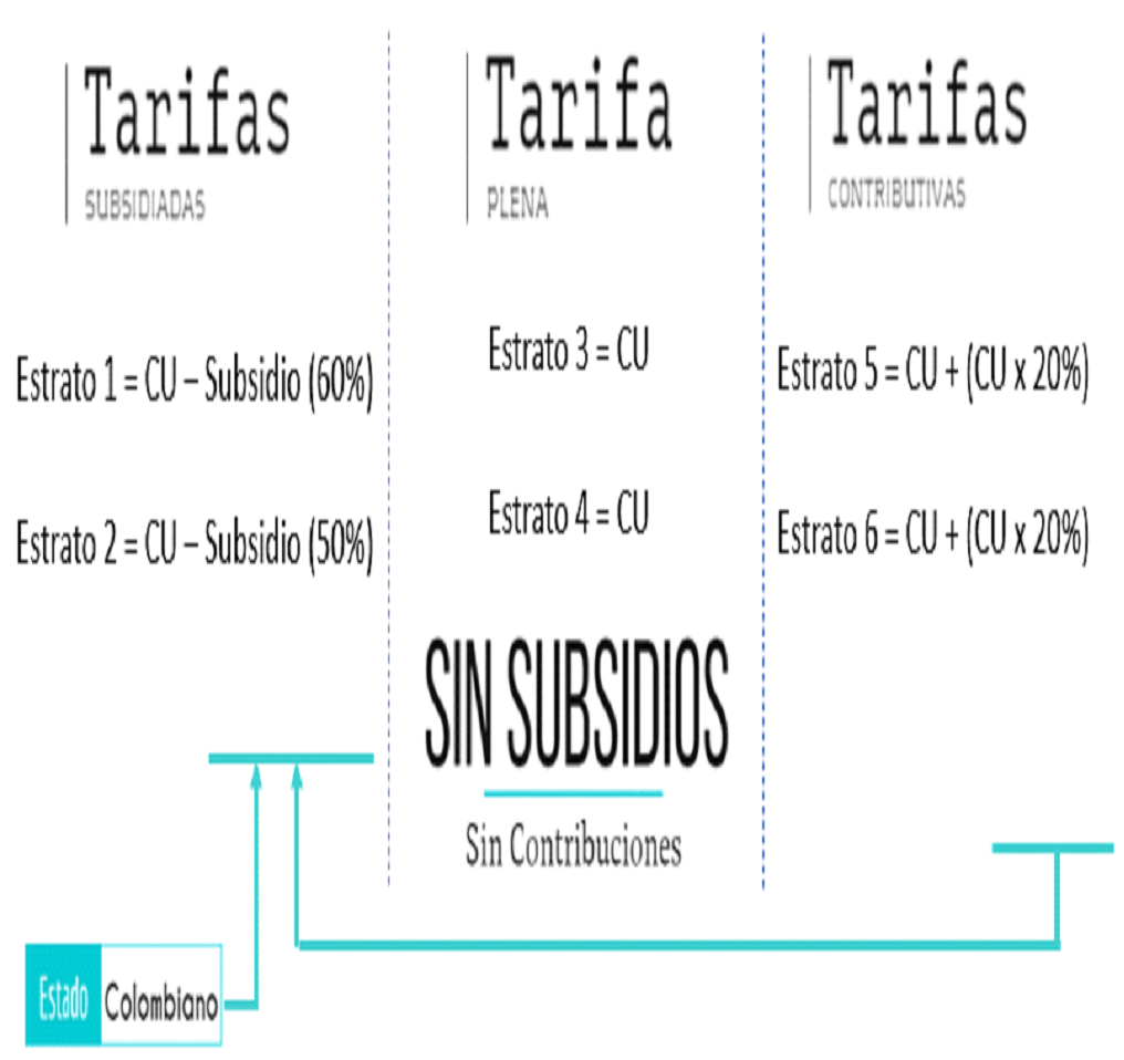 Los usuarios residenciales de los estratos 1, 2 y 3 reciben subsidios, mientras que los usuarios residenciales de los estratos 5 y 6 y los usuarios comerciales e industriales pagan un aporte solidario, con el objeto de obtener recursos adicionales para otorgar dichos subsidios. Los usuarios residenciales de estrato 4, así como los usuarios del sector oficial, pagan el costo de referencia del servicio, es decir, no reciben subsidio ni pagan contribución.