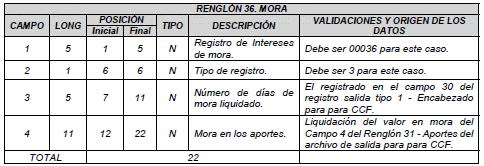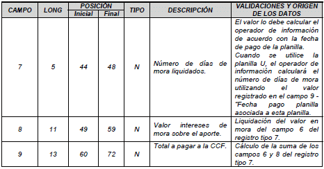 4.5 <Numeral adicionado por el artículo 4 Num. 11 de la Resolución 261 de 2022. El nuevo texto es el siguiente:> La modificación a la longitud de los campos "45 - Días de mora" del numeral 2.1.1 "Estructura de datos del Registro tipo 1. Encabezado del Archivo", "13 - Número de días liquidados en mora" del numeral 2.3.1 "Estructura de datos del registro de salida tipo 3. Total aportes de la planilla para el período de pensiones", "9 - Número de días de mora liquidados" del numeral 2.4.1 "Estructura de datos del registro de salida tipo 4.Total aportes de la planilla para el período al fondo de solidaridad pensional", "10 - Número de días liquidados en mora" del numeral 2.5.1 "Estructura de datos del registro de salida tipo 5. Total aportes de la planilla para el período de salud", "13 - Número de días de mora liquidados" del numeral 2.6.1 "Estructura de datos del registro de salida tipo 6. Total aportes de la planilla para el período a las administradoras de riesgos laborales", "9 - Número de días de mora liquidados" del numeral 2.7.1 "Estructura de datos del registro de salida tipo 7. Total aportes de la planilla para el período a las cajas de compensación familiar", "8 - Número de días de mora liquidados" del numeral 2.8.1 "Estructura de datos del registro de salida tipo 8. Total de aportes del período para el SENA", "8 - Número de días de mora liquidados" del numeral 2.9.1 "Estructura de datos del registro de salida tipo 9. Total aportes de la planilla para el período al ICBF", "8 - Número de días de mora liquidados" del numeral 2.10.1 "Estructura de datos del registro de salida tipo 10. Total de aportes de la planilla para el período a la ESAP" y "8 - Número de días de mora liquidados" del numeral 2.11.1 "Estructura de datos del registro de salida tipo 11. Total aportes de la planilla para el período al Ministerio de Educación.