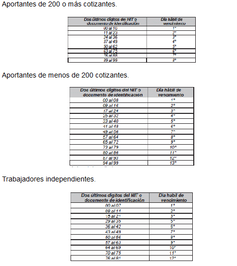 Fechas límites de pago: Son las fechas máximas establecidas para el pago de aportes al Sistema de Seguridad Social Integral y Parafiscales de acuerdo con los dos últimos dígitos del tipo de documento del aportante establecidas en los artículos 3.2.2.1, 3.2.2.2 y 3.2.2.3 del Título 2 de la Parte 2 del Libro 3 del Decreto número 780 de 2016 o aquel que lo modifique o sustituya.
