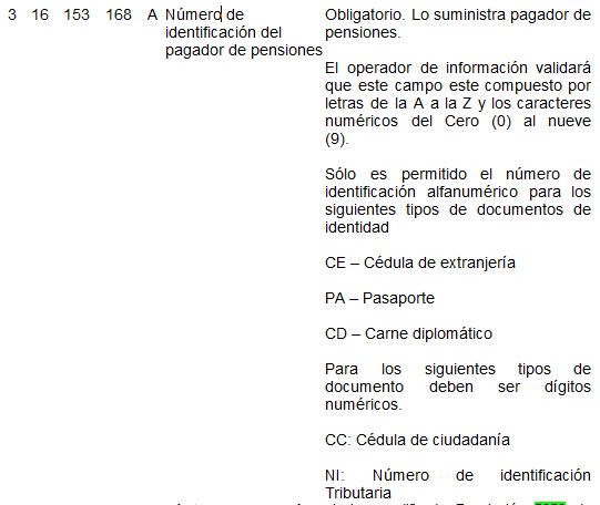 | 7 | 16 | 33 | 48 | A | Número de identificación (NIT) de la CCF. | Para activos es el tomado en el campo 4 del registro tipo 7 del Anexo Técnico 2. Para pagadores de pensiones es el tomado en el campo 4 del registro tipo 6 del Anexo Técnico 3. |