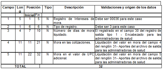 | 9 | 11 | 56 | 66 | N | Valor intereses de mora sobre el aporte. | Tomado en el campo 7 del registro tipo 9 del Anexo Técnico 2. |