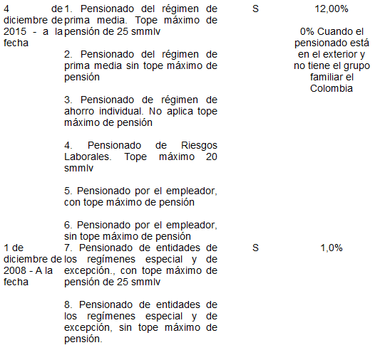 Aportes al Sistema General de Seguridad Social en Salud: Corresponde a las cotizaciones que realizan a través de la Planilla Integrada de Liquidación de Aportes (PILA), las personas obligadas a cotizar al Régimen Contributivo, es decir, aquellas vinculadas mediante contrato de trabajo o como servidores públicos; los pensionados; los jubilados; los independientes; los rentistas; los propietarios de las empresas, y en general todas las personas residentes en el país que no tengan vinculo legal y reglamentario con algún empleador y cuyos ingresos mensuales sean iguales o superiores a un salario mínimo mensual legal vigente.