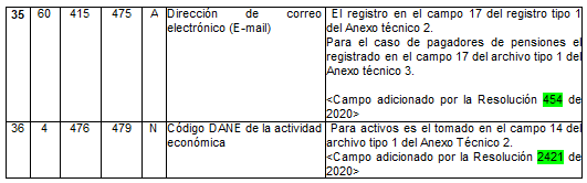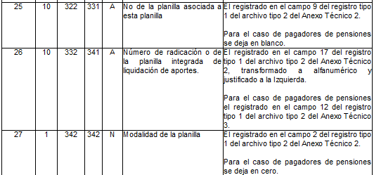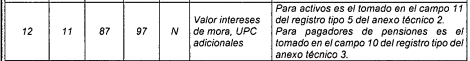 | 3 | 2 | 10 | 11 | N | Código del operador | Para activos es el tomado en el campo 28 del archivo tipo 1 del anexo técnico 2. Para pagadores de pensiones es el tomado en el campo 25 del archivo tipo 1 del anexo técnico 3. |