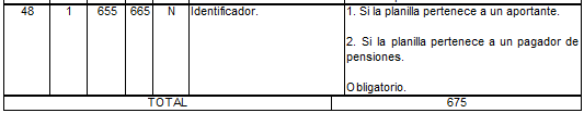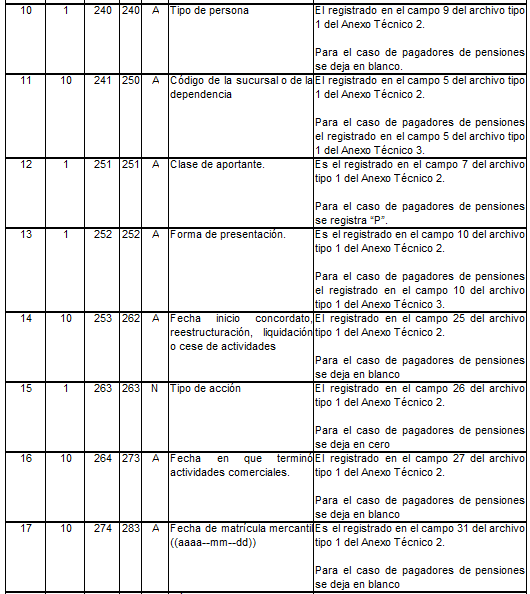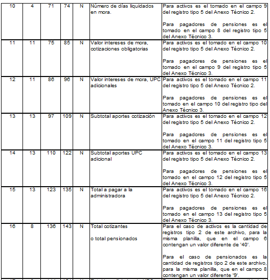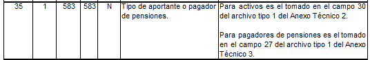 | 5 | 15 | 22 | 36 | N | Total a pagar a pensiones. | Para activos es el tomado en el campo 2 del registro tipo 12 del Anexo Técnico 2. Para pagadores de pensiones es el tomado en el campo 2 del registro tipo 7 del Anexo Técnico 3. |