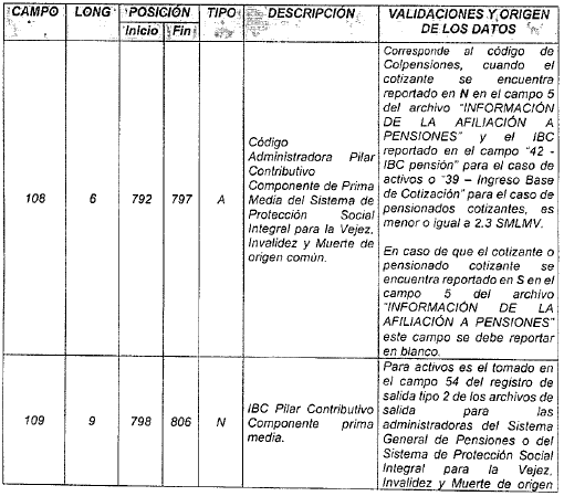 La adición de los campos "108 - IBC Pilar Contributivo Componente prima media", "109 - IBC Pilar Contributivo Componente Ahorro individuar, "110 - Cotización a pensiones Pilar Contributivo Componente de Prima Media", "111 - Cotización a pensiones Pilar Contributivo Componente Ahorro individual", "112 - Transición" y "113 - Seguro Previsional" en el numeral "2.2.1 Estructura de datos del registro de salida tipo 2. Liquidación detallada planilla"] y la adición del campo "19 - Fondo de Previsión" en el numeral "2.3.1 Estructura de datos del registro de salida tipo 3. Total aportes de la planilla para el período de pensiones" deberán ser implementados por los operadores de información para los pagos que realicen los aportantes a partir del 1o de agosto de 2025 para el periodo de cotización julio 2025.